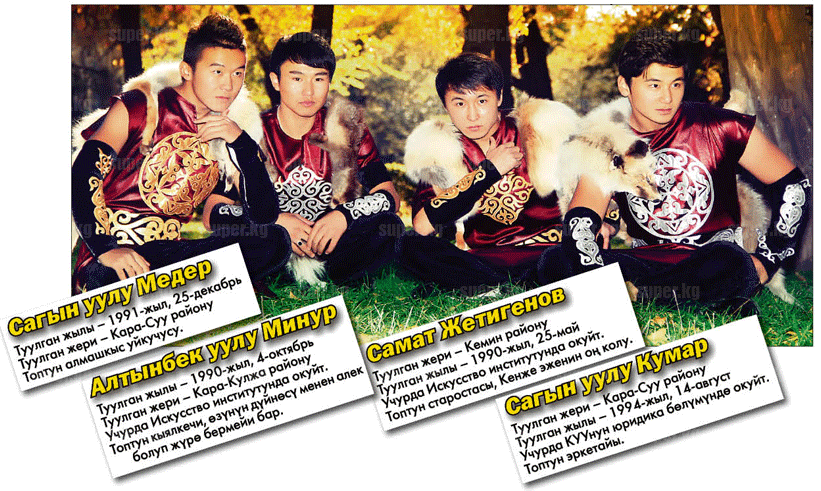 «Супер топ-2012» наамына талапкер «Жебе» тобу:«МИКРОФОНДУ КАРМАП ЫРДАП КОЙСОК БОЛДУ ДЕП ОЙЛОЧУБУЗ»№523 9-Ноябрь-15-Ноябрь, 2012-ж Мурун жалаң кыздар менен иштешкен Кенже Дүйшеева «Жебе» деген мырзалардан турган топту алып чыкты. Азыр топтун жигиттеринин акырындык менен күйөрман топтоп, аты элге тааныла баштаган кез.