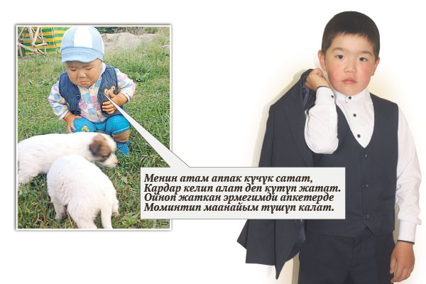 – Мен 1-класста окуйм. Мектепте 2 досум бар. Мага китеп окуган жаккан жок. Ойногонду жакшы көрөм, мисалы, жашынмак, анан кубалашмак ойнойм. Футболду да жакшы көрөм, бирок тобум жок. Телевизордон мультфильмдерди көп көрөм. "Сулайман" деген кино жагат, анткени ал жакта көп аттар бар. Мен кийин машина айдабай эле ат минип жүрө берем. Атамдай болуп комуз чертиш үчүн көп нерсе жатташ керек да, ошондуктан комуз чертким келбейт. Ырчылар жакпайт. Алар дайыма окшош эле ырдай беришет. Чоңойсом футболчу же милиция кызматкери болом. Бактыгүл Момбекова "Супер-Инфо" гезитинин материалдары жеке колдонууда гана уруксат.Жалпыга таратуу "Супер-Инфо" гезитинин редакциясынын жазуу түрүндөгү уруксаты менен гана болушу мүмкүн. Рейтинг: