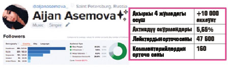 Инстаграмдагы кызыктар: 1000 катталуучу – 300 сом№826 31-август-6-сентябрь, 2018-жыл Инстаграм социалдык түйүнү белгилүү адамдардын белгилүүлүгүн арттыруу менен гана чектелбей, кошумча каражат тапчу булакка айланганына көп болду. Ал тургай абройду ченөө Инстаграм катталуучулардын саны менен өлчөнө турган заман келди. Миңдеген, миллиондогон катталуучулар... Бирок бул сандар реалдуу адамдарбы же жасалма жол менен көбөйтүлгөн "жансыз" адамдарбы, кеп ушунда. Өлкөбүздөгү Инстаграм колдонуучулардын ичинен көп катталуучусу бар адамдардын алдыңкыларын аккаунттарынын HypeAuditor атайын кызматынын жардамы менен анализдеп (29-августка карата статистика) көрдүк. Светлана Марголистин СММ студиясынын жүргүзгөн изилдөөсүнө таянсак, бүгүнкү күнү Кыргыз өлкөсүнүн аймагында 1 миллион 400 миңден ашуун Инстаграм колдонуучу бар. Бирок бул ошончо сандагы адам аталган социалдык тармактын колдонуучусу дегенди түшүндүрбөйт. Бул сандардын ичинде жандуу да, жансыз да колдонуучулар болушу мүмкүн. ВКонтакте – 1 479 000. Инстаграм – 1 400 000 Одноклассники – 782 000. Фейсбук – 590 000 Жандуу аккаунт деген чыныгы адамдын баракчасы. Интернетте жансыз да аккаунттар болот. Алар “бот” деп аталат. Бот – робот деген сөздүн кыскартылган версиясы. Бул адамдарга тиешелүү кандайдыр бир аракеттерди автоматтык түрдө жасай турган интернеттеги программа. Кыргыз өлкөсүнүн аймагында эң көп окурманы бар аккаунттун ээси ырчы, актриса, Кыргыз Республикасынын Эмгек сиңирген артисти Самара Каримова. Бүгүнкү күндө ырчынын 1 миллиондон ашуун окурманы бар. Жогорудагы программа чыгарган жыйынтыкка таянсак, алардын ичинен реалдуу катталуучулардын саны жалпы колдонуучулардын 77 пайызын түзөт. Катталгандардын калганы же 200 миңден ашыгы күмөн жараткан аккаунттар. Ырчы 28-август күнү Инстаграмдагы аккаунтуна расмий тастыктама алып, кыргыз шоу дүйнөсүнүн өкүлдөрүнүн ичинен верификацияга ээ болгон биринчи ырчы аталды. Инстаграм дүйнөсүндөгү дагы бир көрүнүктүү ырчы Анжеликанын окурмандарынын саны 966 миңге жетет. Алардын 806 миңи реалдуу катталуучу болсо, калганы күмөн жараткан аккаунттар. АЙЖАН АСЕМОВА
