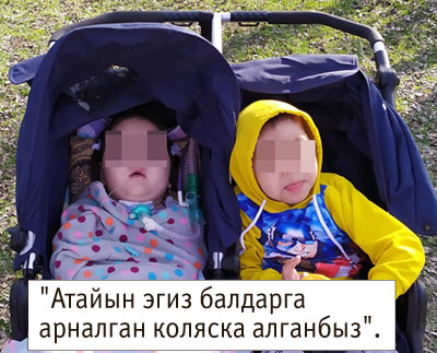 Туугандардан акча алып, Орусияга жөнөдүк. Ал жакта медицина күчтүү эмеспи. Биздин документтер даяр болгончо кызымдын дем алуусу оорлоп, “Тез жардам” чакырттык. Жандандыруу бөлүмүнө алып кирип кетишти. Бир сааттан кийин “аппаратка уладык, абалы оор, үйүңө бара бер” дешти. Кызым ооруп калганда эле баламды эмчектен чыгарып койгом. Аны жакындарым, жолдошум карап жатышты. 4 ай дегенде “жүлүндө маселе бар, аппарат алышыңар керек” деп моюнуна түтүкчө коюп беришти. Аппаратты ошол жактан кайрымдуулук фонддор алып беришкен. 2016-жылдын июль айынан бери кызым ошол түтүкчө менен дем алып, аппаратка байланып жашап келет. Орусиядан аппаратты кантип колдонуу керектигин үйрөтүштү. Кийин Кыргызстанга келгенде аппаратыбыз бузулуп калып, SUPER.KG порталы аркылуу элден жардам сураганбыз. Бул аппарат өпкөнүн ролун ойнойт. Байланыштырып турган түтүкчөнү улам тазалап туруу кажет. Тамакты да түтүкчө аркылуу ичет. Учурунда кызым деп жүрүп, балама көңүл бурбай жүрө бериптирбиз. Басканы кечеңдегенде дарыгерлерге көрсөтсөк, диагнозу кызымдыкындай экенин айтышты. Эки балам тең ооруп калганда өтө катуу нес болдук. Кудайга шүгүр, балам азыр жакшы. Бирок буга да аппарат алышыбыз керек, фонддорго кайрылып жатабыз. Орусияга кетели десек, дарыгерлер “кепилдик жок, учакта алып жүрүүгө болбойт” дешкенинен бул жакта эле калалы дедик. Жолдон жоготуп алганча көбүрөөк жашаганы жакшы. Мурун элден коруна берчүбүз, азыр балдарды жашырбайбыз, аппаратта жатканы аз келгенсип төрт дубалда камап отурбайлы дейбиз. Биз көргөн жашоону көрсүн деп соода борборлоруна барсак да, конокко барсак да кызымды аппараты менен көтөрүп алабыз. Адамдар менен аралашкан буларга да жагат. Алардын үнүн угуп, күлүп көңүлү ачылат. Аппаратка керектүү түтүкчө, фильтр, нымдандыруучу каражаттардын баарын ай сайын алмаштырып турабыз. Ага