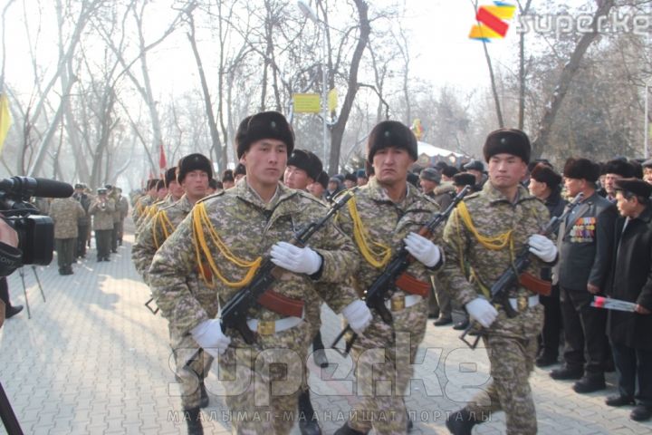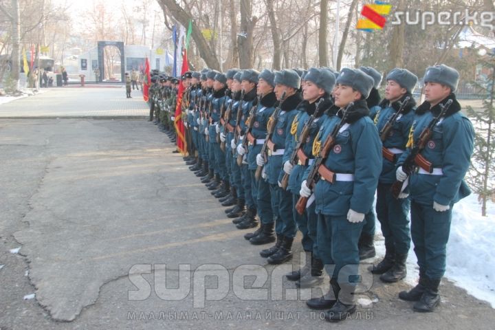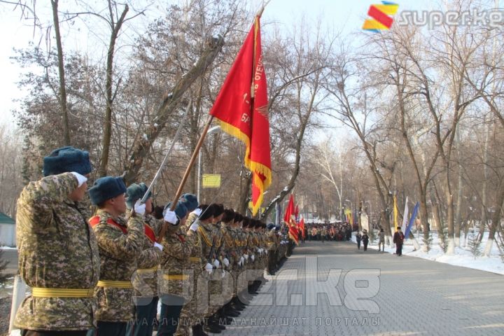 Жаш жоокерлер Ооганстанда курман болгон интернационалист жоокерлердин жаркын элестерине аскердик урмат көрсөтүп, салтанаттуу жүрүш менен өтүштү.