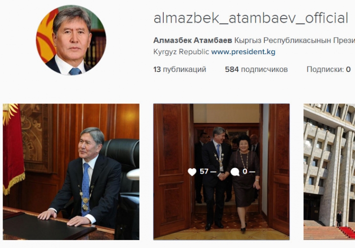 Президент Алмазбек Атамбаев Instagram социалдык түйүнүндө almazbek_atambaev_official аттуу өздүк баракчасын ачты. Өлкө башчынын баракчасы ачылгандан кийин 6 саатта эле 500дөн ашуун интернет колдонуучу жазыла алды. Президенттик аппараттан кабарлашкандай, аталган баракчаны өлкө башчынын маалымат кызматы көзөмөлдөп, расмий кабарларды жарыялап турушмакчы.
