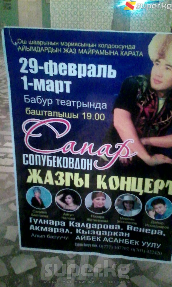 Оштогу Бабур атындагы театрда Сапар Сопубеков менен Гүлжигит Сатыбеков биргеликте концерт берүүгө мажбур болушту. Бул тууралуу окурман бүгүн, 29-февралда SUPER.KG порталына WhatsApp аркылуу билдирди.