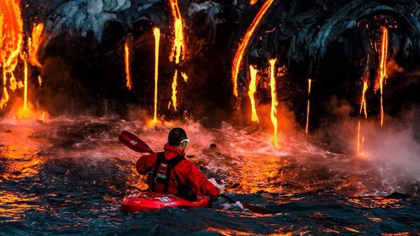 Гавайидеги лава агып жаткан сууда кайыкта сүзгөн экстремал. Килауэа жанар тоосу 600 миң жыл мурун пайда болгон. Анын акыркы атылуусу 1983-жылы башталып, азыркыга чейин уланып, тарыхта эң узакка созулган атылуу болуп эсептелинет. Жанар тоонун бул атылышында 190 чарчы метр кургактык пайда болгон. Учурда дүйнө жүзүндөгү эр жүрөктөр Тынч океанга 1000 градус менен куюлуп жаткан лаванын булагынан бир нече гана метр алыстыкта сүзүп өтүү мүмкүнчүлүгүнө ээ.