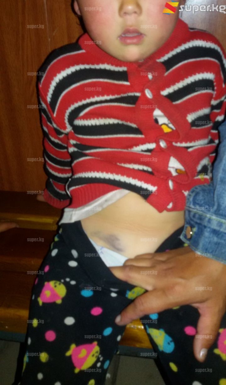 Мен жумуштан келсем, 4 жаштагы кызымды атасы мас абалында табарсыкка катуу нерсе менен чапканбы же тепкенби, көгөрүп калыптыр. Кызымды соттук-медициналык экспертизадан өткөрөм, дарыларына кеткен чыгымды төлөп берсин",- деди ал.