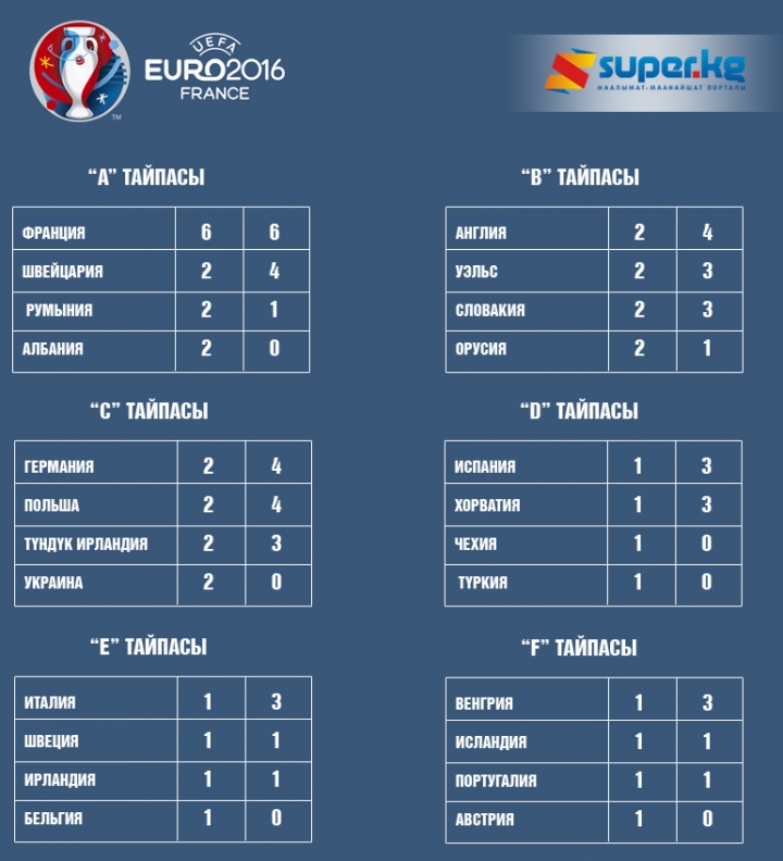 Франциядагы Европа чемпиондугунда "В" тайпасында кийинки турга чыгуу үчүн күрөш кызуу уланууда. 2-турда Англия курамасы Уэльсти утуп, 3 упайга ээ болду. Беттеште Уэльс эсепти ачканы менен, Англия акыркы мүнөткө чейин жан үрөп, жеңишти өз эсебине оодарып кетти.