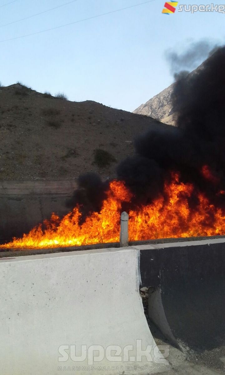 "Күйүүчү майды ташып бараткан унаанын алдынкы дөңгөлөгү жарылып, ал жолдон чыгып тосмону сүзүп, өрт чыккан. Натыйжада күйүүчү май Р-4 каналына дагы төгүлгөн. Унаанын айдоочусу Ж.Төлөгөн аттуу жаран эч жаракат алган эмес. Өрт өчүрүүчүлөр күйүүчү май каналга төгүлгөндүгү тууралуу Ак-Сай айыл өкмөтүнө караштуу Миң-Булак айыл башчысына билдиришкен", - деп айтылат маалыматта.