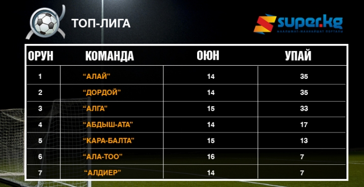 Бүгүн, 14-октябрда футбол боюнча өлкө чемпиондугу – ТОП-Лиганын алкагында 2 оюнга орун берилет. Беттештердин бири Бишкекте, бири Кантта өтмөкчү. Бишкектик “Алга” клубу “Кара-Балта” клубун кабыл алса, канттык “Абдыш-Ата” куршабдык “Алдиер” менен беттешет.