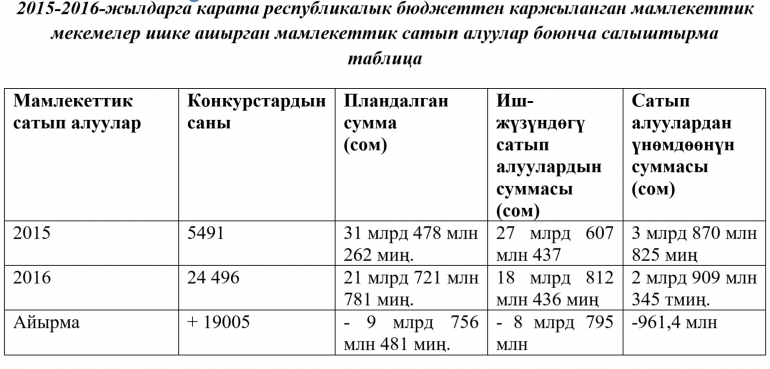 "2016-жылы республикалык бюджеттен каржыланган мамлекеттик мекемелер 10 миллиард 596 миллион сомго товарларды, 1 миллиард 345 миллион сомго кызматтарды, 6 миллиард 868 миллион сомго жумуштарды жана 3 миллион 689 миң сомго консультациялык кызматтарды сатып алышкан", - деди Даникеев.