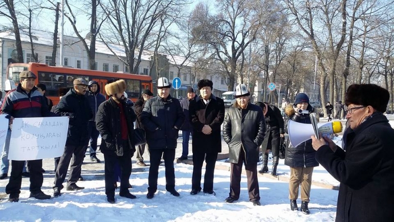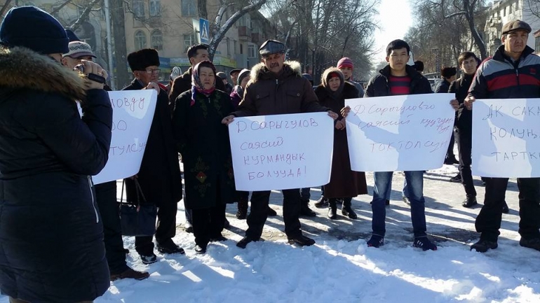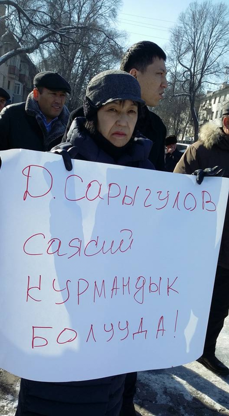 Алар Дастан Сарыгуловго саясий куугунтук токтолушун, мыйзамдуу сот чечими чыгышын талап кылды. Колдоруна "Сарыгуловду каралоо токтотулсун", "Аксакалдан колуңарды тарткыла", "Сарыгулов саясий курмандык болууда" деген жазууларды көтөрүп алган.