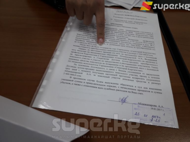 "2010-жылы Венера Маймендеева аттуу жаран Чүй облусунун Воронцовка айылы тараптагы алма бактан жер алып берем деп 2 миллион 400 миң сом акчабызды алып кайтарып бербей жатат. Бүгүнкү күндө жер да жок акчабыз да кайтырылбай жатат. Буга чейин ар кандай шылтоолорду айтып качып жүрөт. Бул иш боюнча ИИМге кайрылдым. Бирок бүгүнкү күндө жыйынтык жок", - деп билдирди шаар тургуну Аяна Абдыжапарова.