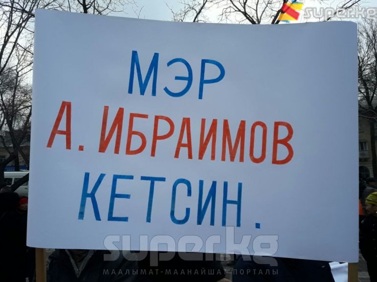 100дөн ашуун митингчилер шаар мэри Албек Ибраимовдун кетүүсүн талап кылып, "Урматтуу президент, мыйзамсыздыкты токтотуңуз!" деген плакаттарды көтөрүп алышкан.