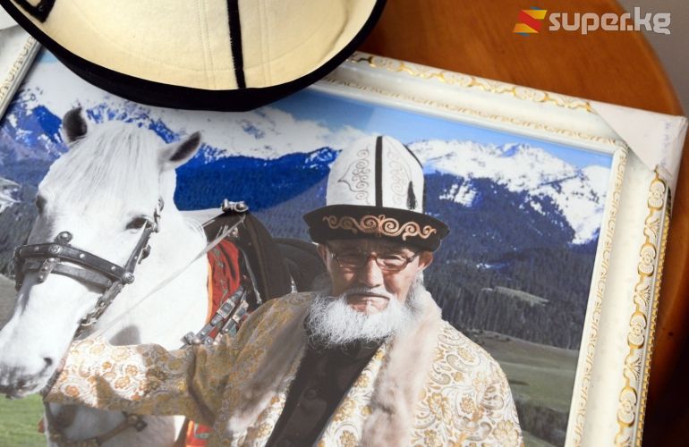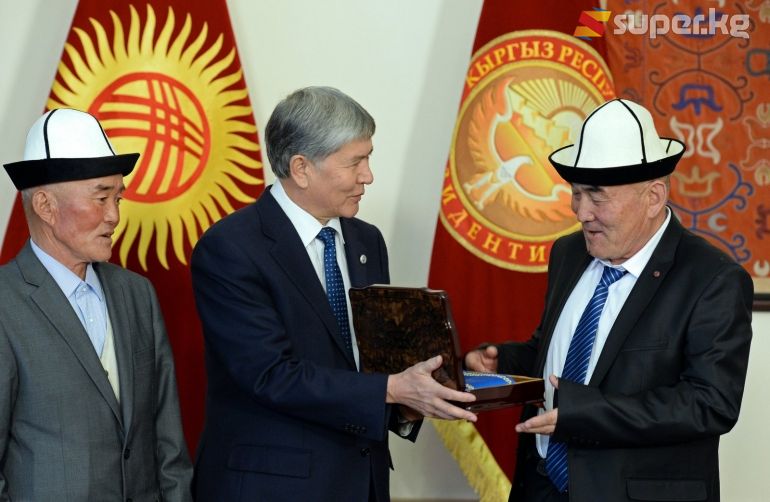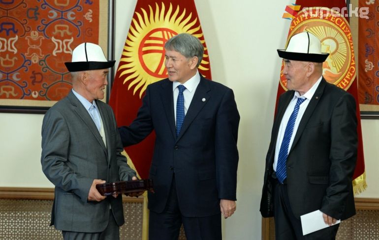 Алмазбек Атамбаев манасчы Жусуп Мамайга берилген "Кыргыз Республикасынын баатыры" жогорку наамын анын уулдарына тапшырды