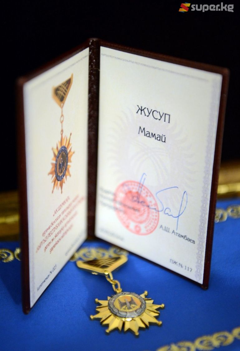 Бүгүн, 15-апрелде президент Алмазбек Атамбаев манасчы Жусуп Мамайга берилген "Кыргыз Республикасынын баатыры" жогорку наамын "Ак шумкар" өзгөчө белгиси менен анын уулдары Абдыгазы Мамай менен Мукаш Мамайга тапшырды. Бул тууралуу президенттик аппараттан билдиришти.
