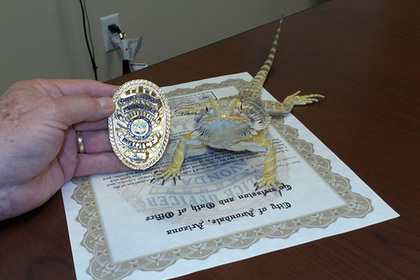 Маалыматтарда кескелдириктердин сакалдуу агама түркүмүнө кирген жандык 14-апрелде ант берип, төш белги алганы айтылат. Ал Аризона департаментине баӊги заттарынын кээ бир түрүн жытынан таанып билүү үчүн алынып келинген.