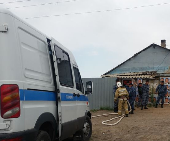 Казак президентинин сүрөтү чапталган эски үйдүн эшигин полиция талкалап, бузуп кирди