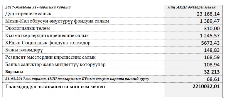 2017-жылдын I чейрегинде 134682 унция же 4,19 тонна алтын сатып өткөрүлгөн. Алтынды сатып өткөрүүдөн жалпы киреше 2017-жылдын биринчи үч айында 164,1 миллион долларды түзгөн.