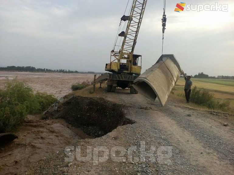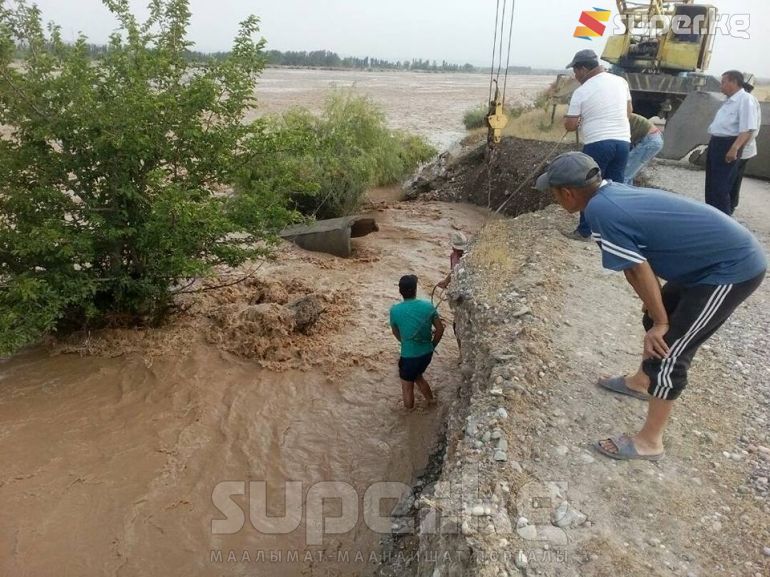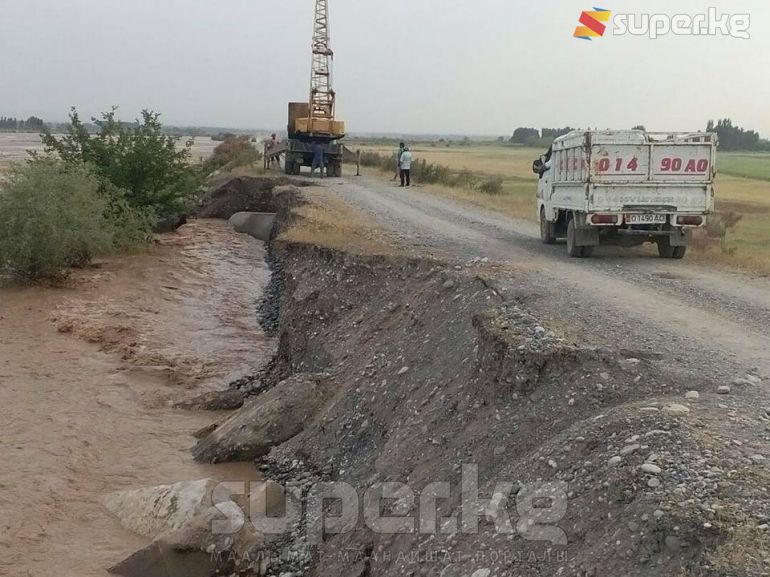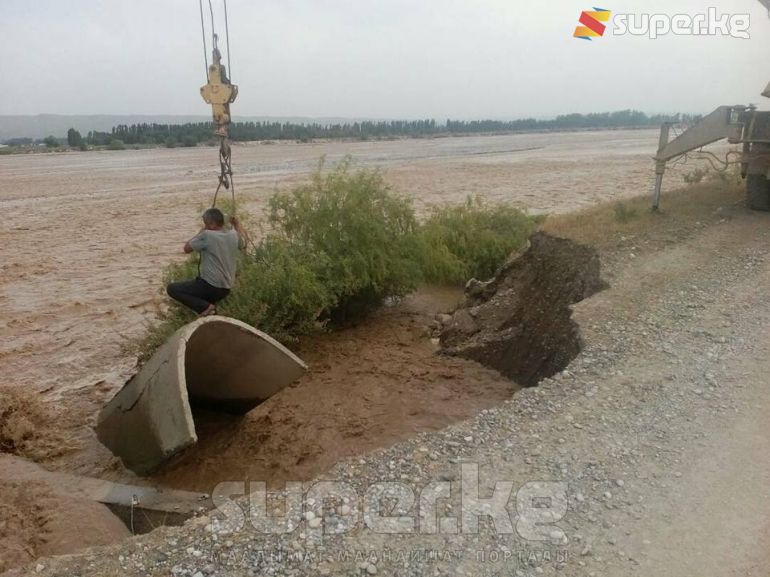 "Кара-Үңкүр дарыясынын оң жээгине курулган дамбанын 50 метр аралыгын суу жеп, ашып кетүү коркунучу жаралган. Бүгүнкү күндө тосмону бекемдөөгө 4 инженердик техника жана жергиликтүү тургундар тартылган. Кооптуу абал жаратып жаткан коргоочу дамбаны таш менен бекемдөө жумуштары аткарылып коркунуч жоюлган. Учурда бекемдөө жумуштары уланууда", - деп билдирди басма сөз кызматы.