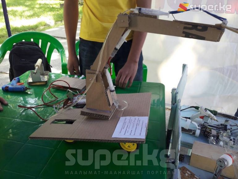 Токтогул районунун 5-классынын окуучусу Бектур Садиров балдардын майрамына өзү жасаган жүк көтөрүүчү техникасын көргөзүү үчүн алып келген.