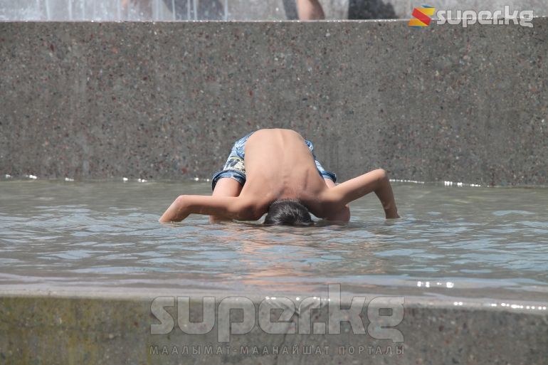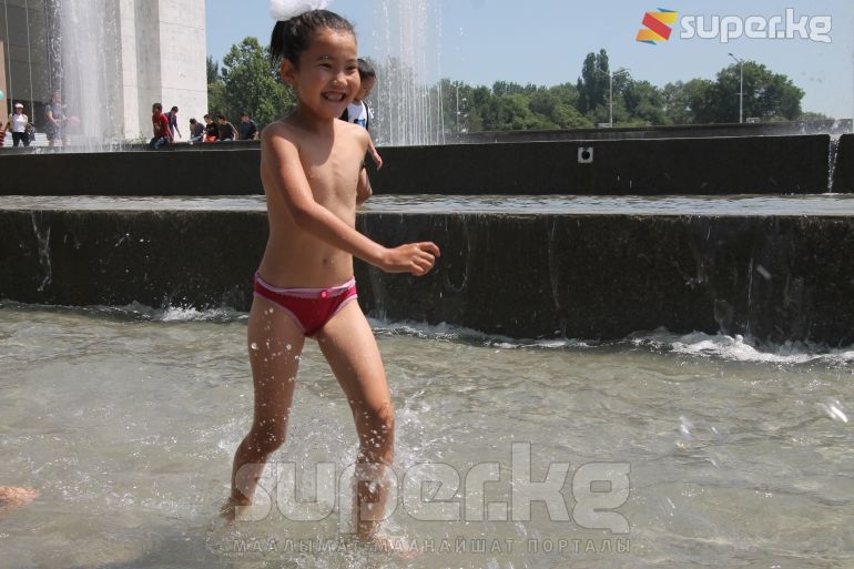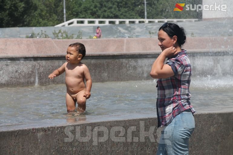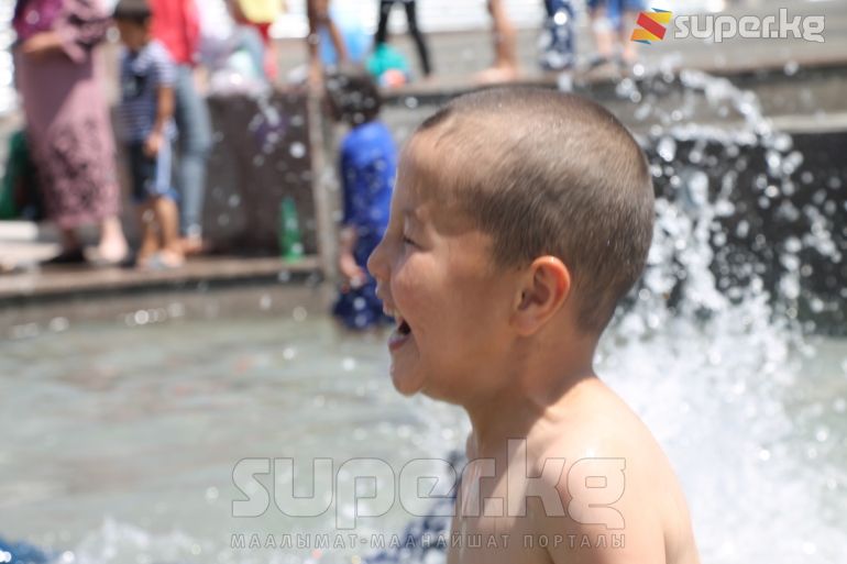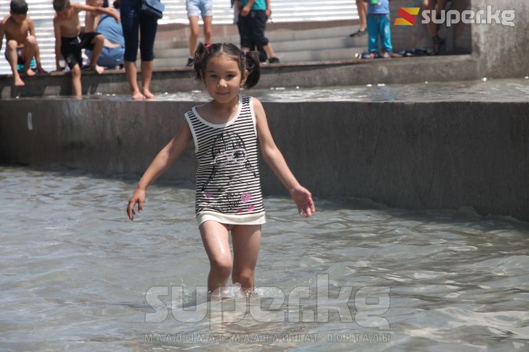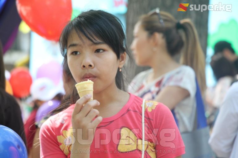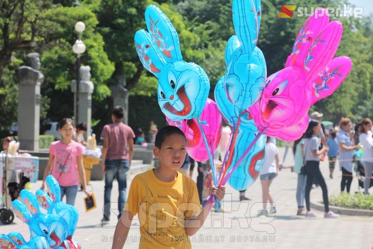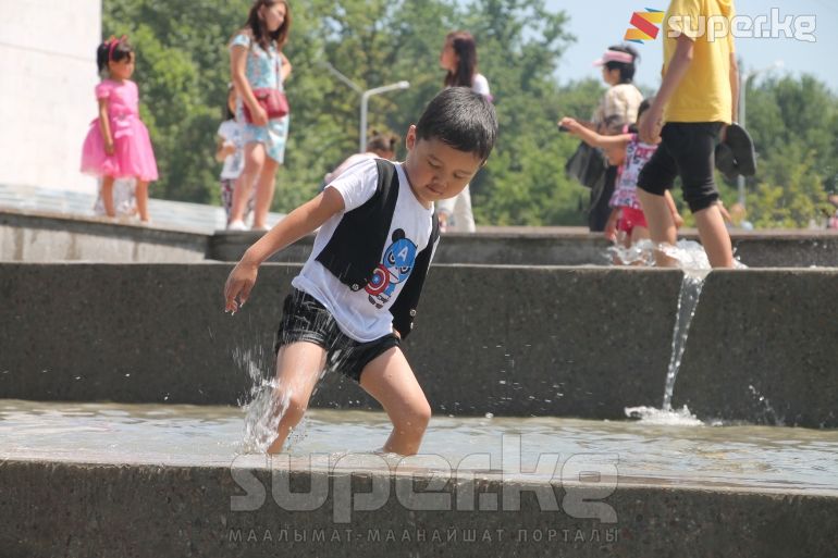 Бишкек шаарында өтүп жаткан майрамда айрымдар ата-энелери менен шаар аралап эс алса, башкалары эс алуучу жайларда аттракциондорго чыгып көңүл ачууда. Эс алууга келгендердин катарында балмуздак сатып алууга кезекке тургандар да арбын. Кээ бир балдар шар ойноп, фонтан суусуна чөмүлүп жатышат.