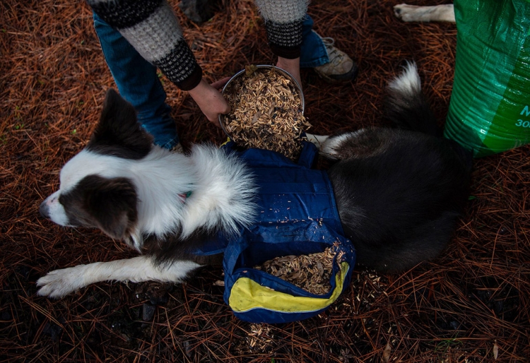 Атайын иттер үчүн тигилген сумкаларга урук салынып, алар токойго коё берилет. Иттер чуркаганда сумкадан уруктар түшүп турат. Долбоордун авторлору уруктар өнүп чыкса, өрттөн качкан токой жашоочулары кайтып келишерине үмүттөнүшүүдө.