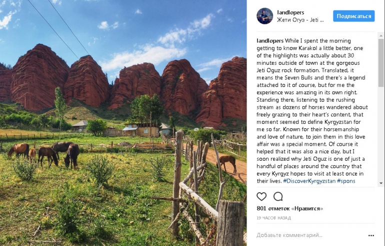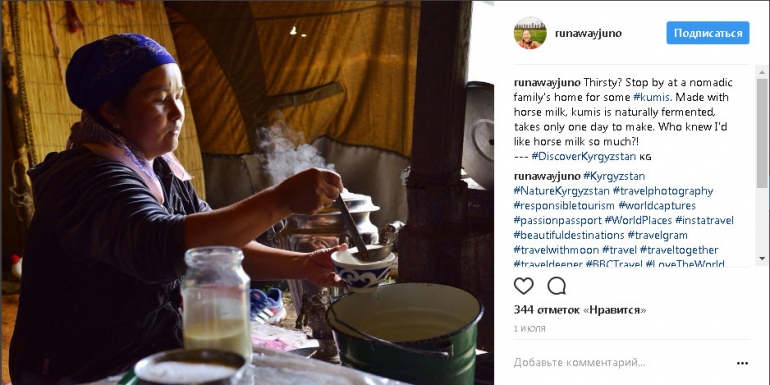 Ли Жу Но (@runawayjuno) аттуу корей улутундагы саякатчы блоггердин өздүк баракчасы да Кыргыздын тоолорунун кооздугу, кымыз куюп жаткан аял жана Көк бөрү ойноп жаткан мырзалардын сүрөтү менен толукталды. Анда Соң-Көл, Көк-Көл жана Ысык-Көлдө тартылган сүрөттөр бар.