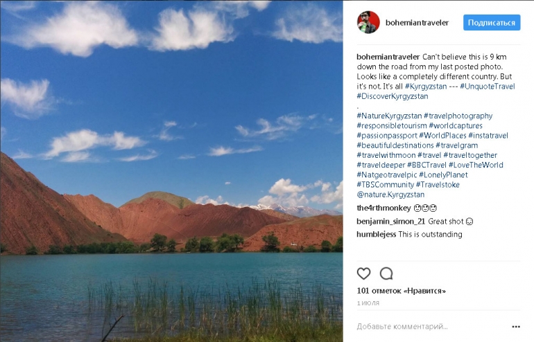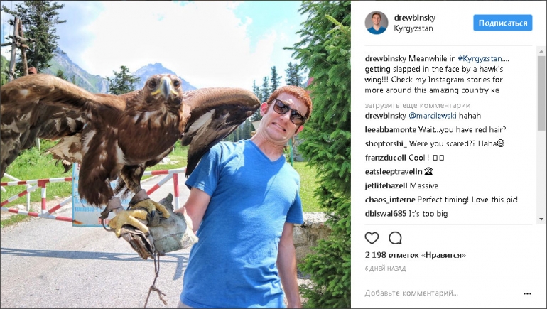 Филиппиндик Дрю Бински (@drewbinsky) өзүнүн социалдык баракчасына Борбордук Азиядагы өлкөлөрдү кыдырып жүргөнүн жазат. Анын ичинде Кыргыздан сырткары Казакстан, Тажикстан, Өзбекстанда болгонун белгилеп, ар бир өлкө өзүнчө уникалдуулукка ээ экенин жазган. "Кыргыздын аймагынын көп бөлүгүн тоолор ээлейт экен. Кыргыздардын келбети көбүнесе монголдорго окшоп кетет. Көчмөн эл экени белгилүү, азыр да боз үйдө жашагандар бар" деп жазат Дрю Бински.