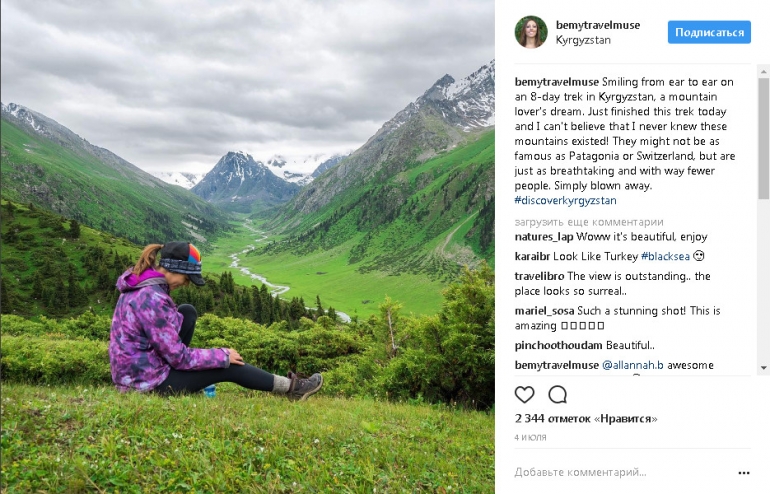 Саякатчы калифорниялык Кристиан Эддис (@bemytravelmuse) да дүйнө кыдырып, тарткан сүрөттөрүн өзүнүн сайтына жайгаштырып турат. Андан сырткары социалдык тармактардагы окурмандары үчүн жарыялаганын көрүүгө болот. Ал да Кыргыз тоолоруна суктанып Швейцариядагы тоолор менен салыштырган.