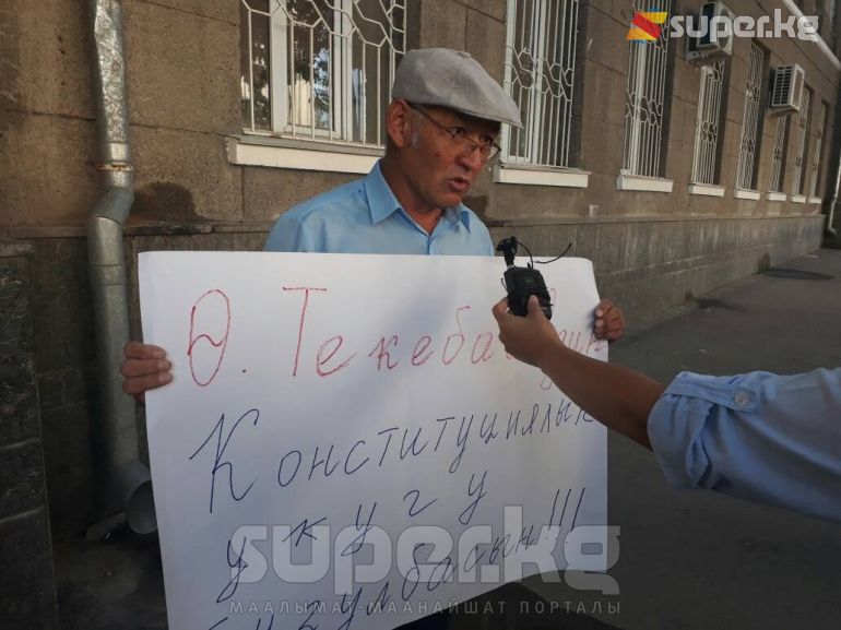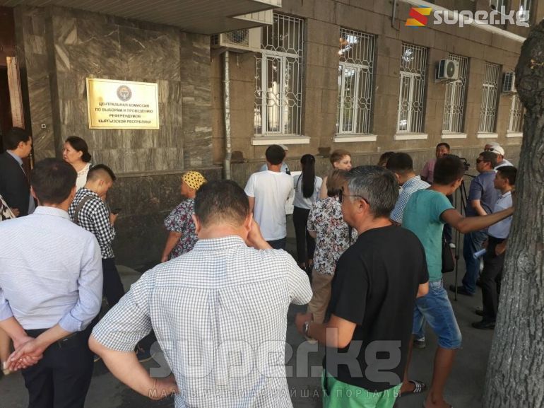 Бүгүн, 26-июлда "Ата Мекен" фракциясынын лидери Өмүрбек Текебаевдин тарапташтары Борбордук шайлоо комиссиясынын алдына чогулушууда. Алар президенттикке талапкер Текебаевди мамлекеттик тил сынагына катыштыруу үчүн шарт түзүп берүүнү талап кылышууда. Учурда 15ке жакын адам турат. Алардын катарында Жогорку Кеңештин депутаты Алмамбет Шыкмаматов, экс-депутат Асия Сасыкбаева бар. Жарандык активист Өндүрүш Токтонасыров колуна "Текебаевдин Конституциялык укугу бузулбасын", "Шайтан оюндар токтосун" деген жазууларды көтөрүп алган. Бүгүн БШК аталган маселени кароосу күтүлүүдө. БШКнын төрайымы Нуржан Шайлдабекова саат 09:27де келип, жумушуна кирип кетти.
