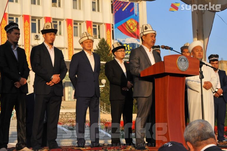 “Баарыңыздарды Курман айт майрамы менен куттуктайм. Улуу Жараткандын эң ыйык күндөрүнүн биринде жүз көрүшүп отурабыз. Бул күнү бардык араздашкандар жарашып, касташкандар достошо турган күн. Курман айт майрамы Кудайдын берекеси жааган күн экендиги айтылып келет. Ошондуктан баардыгыбыз айт намазын окуу менен бирге эле Жараткандан Кыргыз мамлекетине, анын ичинде Ош шаарына береке, тынчтык жана ынтымак тилейли”, - деди Исаков.