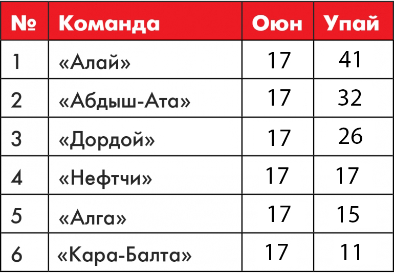 Бул жыйынтык менен "Дордой" командасы 17 оюндун жыйынтыгында 26 упай топтоп 3-орунда кармалууда. Ал эми "Алга" командасы 15 упай менен 5-орунда жайгашкан.