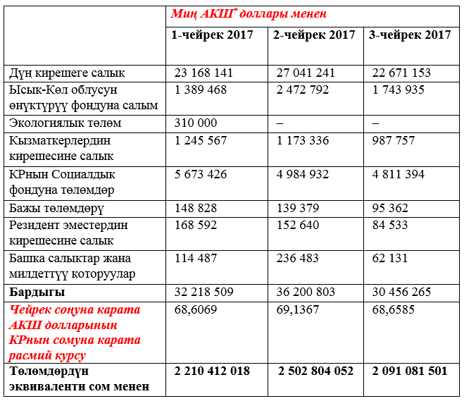 “КУМТӨР” ДОЛБООРУ БОЮНЧА 2017-Ж. ТОГУЗ АЙЫНДАГЫ САЛЫКТАР ЖАНА МИЛДЕТТҮҮ ТӨЛӨМДӨР