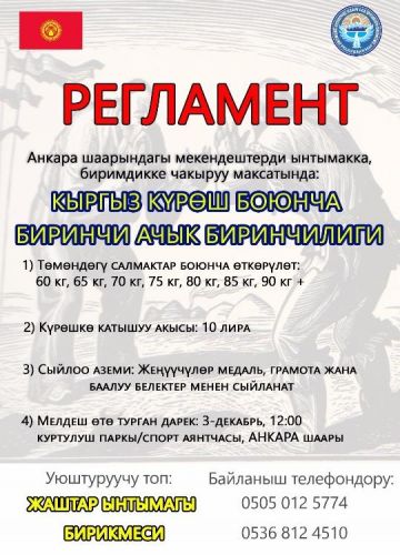 "Биз бул Ачык биринчиликти атайын кыргыздын улуттук оюндарынын бири болгон күрөш боюнча уюштуруп жатабыз, эң негизги максатыбыз Анкарадагы мекендештерибиздин башын бириктирип, ынтымакка чакыруу болуп саналат", - деп билдирди Онобасов.