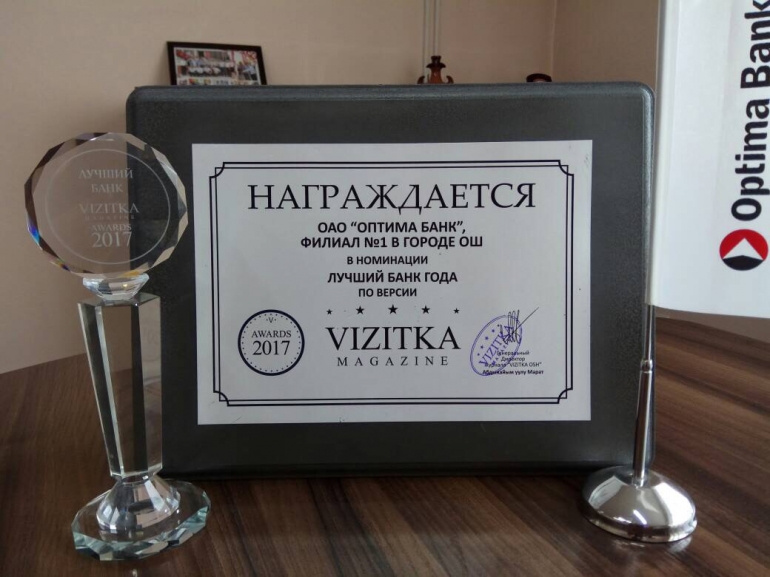 Сиздерге кубанычтуу кабар айтууга шашылабыз! 2017-жылдын 16-декабрында "Vizitka Osh – жыл тандоосу" журналынын версиясы боюнча “Оптима банк” ААКсынын Ош шаарындагы №1 филиалын “Жылдын мыкты банкы” наамы менен сыйлоо салтанаты болуп өттү. Басылма бизнес жана маданият жаатындагы ийгиликке жетишкен адамдарды, рынокто өз ордун тапкан туруктуу компанияларды тандап алган.