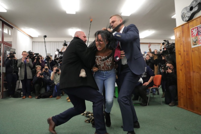 Маалыматка караганда, бүгүн Чехиянын борбору Прага шаарындагы добушканалардын бирине президент Милош Земан келген. Ошол учурда анын маңдайына жарым жылаңач аял "Земан - Путиндин сойкусу" деп чуркап чыккан. Жан сакчылар президент добуш бере электе эле дароо ал жерден алып чыгып кетишкен. Ал эми активист аял полиция кызматкерлерине өткөрүлүп берилген.
