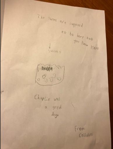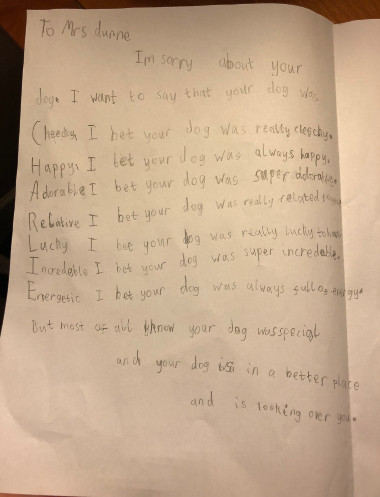 Каллум аттуу окуучу мугалимине сүйүктүү итинин өлүп калгандыгы тууралуу көңүл айтып, өзү ыр жазган. Ал ырында иттин жакшы сапаттарын санап, ал өзгөчө ит болгонун белгилеген. Каттын аягында Каллум мугалимине азыркы тапта ити асманда жакшы жашоодо жашап жаткандыгын айтып "сизге катым жакпай калса жана итиңизди эстетип маанайыңызды түшүрүп алсам кечирим сурайм" деген жазууну калтырган.