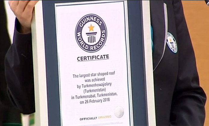 Белгилүү болгондой, Түркмөнстандын өлкө башчысы Гурбангулы Бердымухамедов 26-февралда Түркменабат шаарында жайгашкан эл аралык аэропортту расмий түрдө ачкан. Бул иш-чарада "Гиннесстин рекорддор китебинин" өкүлү Шейда Субаши-Гемиджи "Türkmenhowaýollary" уюмунун жетекчиси Довран Сабуровго "Огуз Хандын жылдызын чагылдырган уникалдуу архитектуралык курулуш" деген "Гиннесстин рекорддор китебинин" сертификатын тапшырган. Аталган аэропорттун аймагы 600 гектар, ал эми жүргүнчүлөр терминалынын имаратынын аянты 37 миң чарчы метрди түзгөн.
