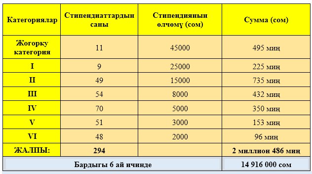 Жаштар иштери, дене тарбия жана спорт агенттиги 2018-жылдын 1-январынан баштап 31-июнга чейин мамлекеттен стипендия ала турган спортчулардын тизмесин жарыялады. Бул тизмеде жалпы эсепте 294 спортчу бар. Стипендиялар 7 категорияга бөлүнгөн, анда 2 миң сомдон 45 миң сомго чейин акчалай сыйлык каралган.