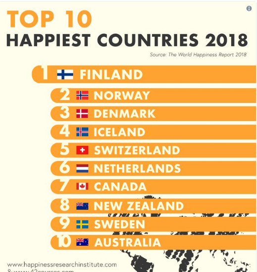 Эң бактылуу өлкөлөрдүн катарын Дания, Исландия, Швейцария, Нидерланды, Канада, Жаңы Зеландия, Швеция жана Австралия толуктаган. Бул өлкөлөрдө адамдын жашоосу жана бактылуу болушу үчүн чыныгы мыкты шарттар түзүлгөнүн изилдөөлөр аныктаган.