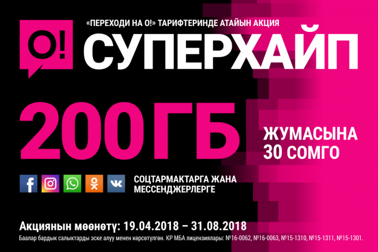 О! Мобилдик оператору атайын сиздер үчүн эң популярдуу "О!го которул+", "О!го которул Light+" жана "О!го которул Light + TV Базалык" тарифтеринде атайын “СУПЕРХАЙП” акцияны баштады. Тарифтин чегиндеги негизги апталык интернет-топтомго сиз 20 эмес, 40 эмес, жадакалса 100 гигабайт интернет эмес, туура 200 (!) ооба-ооба, чын эле уктуңуз, бардык салыктарды эске алуу менен болгону 30 сомго сүйүктүү социалдык тармактарга жана мессенжерлерге колдонуу үчүн “СУПЕРХАЙП” акциясы боюнча толук 200 ГИГАБАЙТ интернетке ээ болосуз!
