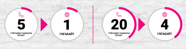 - Эгер сиздин тариф "О!го которул!" же "О!го которул+" тарифтеринин бири болсо, башка мобилдик түйүндөргө 20 мүнөт чалууларды кошумча +4 Гигабайт максималдуу ылдамдыктагы интернетке ээ боло аласыз. Дароо азыр алмаштыруу үчүн *796*4# буйрутмасын териңиз.