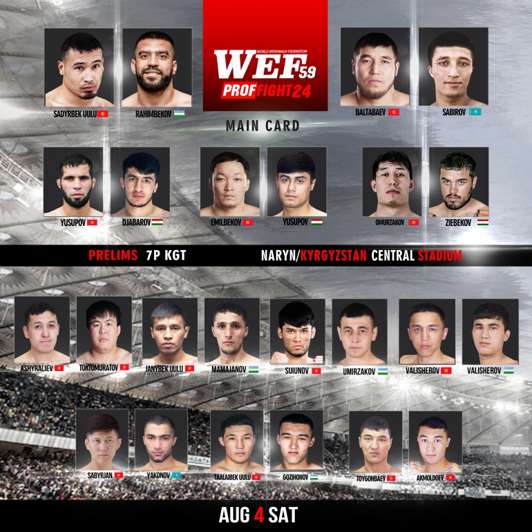 4-августта Нарын шаарында Дүйнөлүк кулатуу федерациясынын эрежесиз уруш боюнча "WEF PROFFIGHT 24" эл аралык мелдеши өтөт. Бул тууралуу SUPER.KG порталына мелдештин уюштуруучулары билдирди.