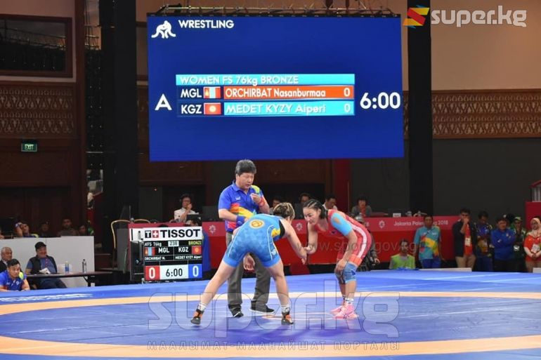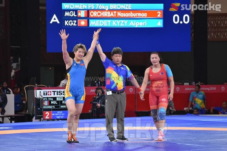 Бүгүн, 21-августта Индонезияда өтүп жаткан Жайкы Азия оюндарында кыз-келиндер арасындагы күрөш боюнча мелдеш болуп өттү. Анда Кыргыз спортчусу Айпери Медет кызы 76 килограммга чейинки салмак ченинде күч сынашты. 3-орун үчүн беттеште кыргыз балбаны монголиялык Орчибат Насанбурма менен кез келди. Беттештин жүрүшүндө Айпери Медет кызы 4 упайга ээ болуп, 4:2 эсеби менен жеңишке жетти.