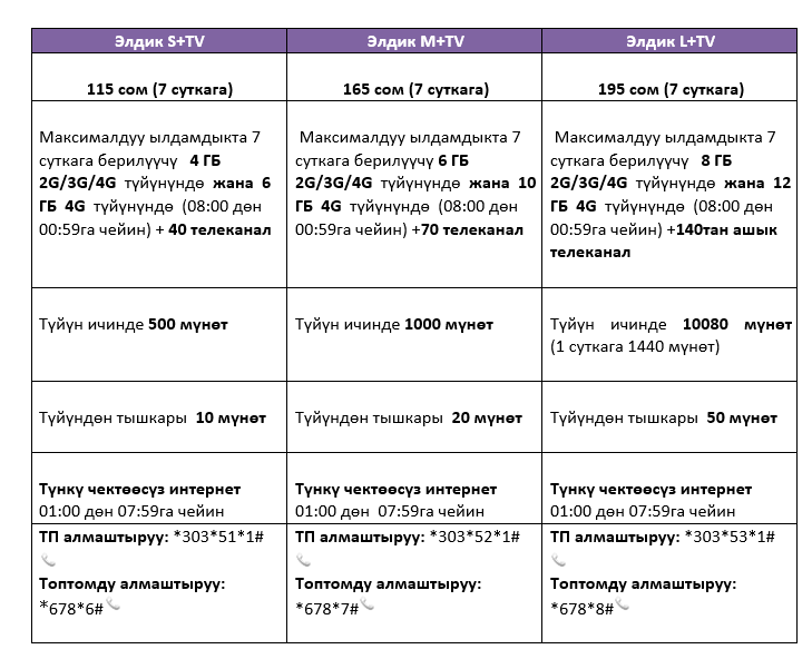 Мындан тышкары "Элдик S/M/L + TV" мобилдик телеберүүнү көрүүнү жактыргандар үчүн гана эмес, активдүү интернет колдонуучулар үчүн да, үн байланышынан көп колдонгондор үчүн да ыңгайлуу. Тариф өз ичине күндүзгү интернеттин болуп көрбөгөндөй көлөмүн, түнкү ЧЕКТӨӨСҮЗ интернетти, түйүн ичиндеги жана түйүндөн тышкары акысыз мүнөттөрдү камтыйт.