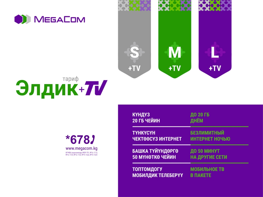 "Элдик S/M/L + TV" тарифтик планын кошуп алыңыз жана Mega iTV уникалдуу сервиси менен Кыргызстандын жалпы аймагы боюнча сүйүктүү телеканалдарыңызды абоненттик төлөмсүз көрүңүз.
