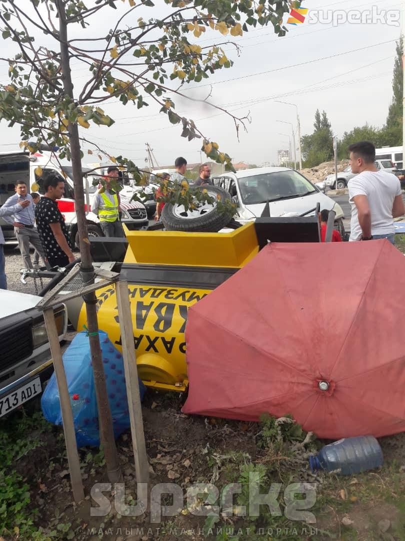 Бишкек шаарында 2 унаа сүзүшүп, анын кесепетинен жол четинде квас сатып отурган аял жабыркады. Бул тууралуу окурман "Элдик кабарга" маалымдады.