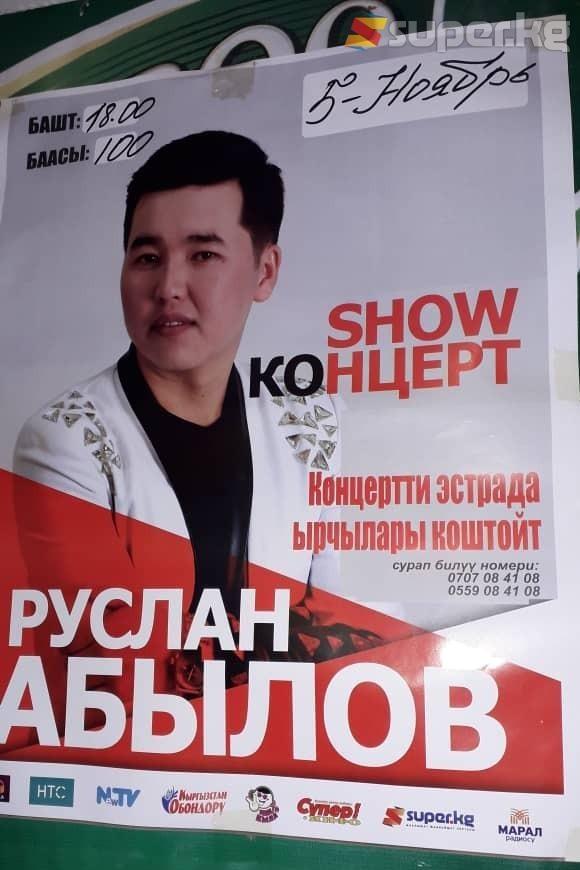 Ырчы Руслан Абылов 5-ноябрда Ысык-Көл облусуна караштуу Түп районунун Санташ айылында белгиленген концертин берген жок. Мындай маалыматты окурман WhatsApp аркылуу "ЭЛДИК КАБАРга" билдирди.