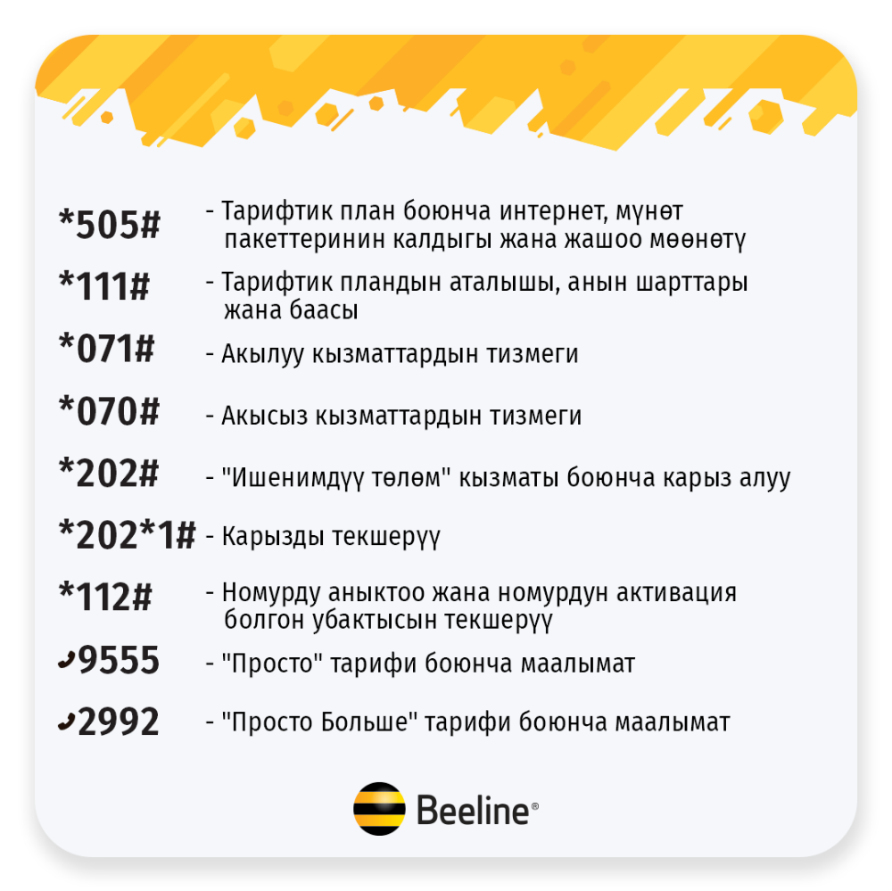 Beeline абоненттери үчүн USSD-буйруктарын сунуш кылабыз. Алардын жардамы менен баланста канча каражат бар экенин, кошулган кызматтар, иштетилген трафиктер, актуалдуу тарифтер жана көптөгөн кызматтар тууралуу кенен маалымат ала аласыздар.