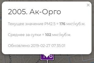 Ак-Өргөө конушунда учурдагы көрсөткүч - 176 микрограмм (сутка ичиндеги орточо көрсөткүч - 102). Бул нормага ылайык көрсөткүчтөн 7 эсеге жогору. Дүйнөлүк саламаттыкты сактоо уюмунда сутка ичинде орточо эсеп менен куб метрге 25 микрограмм болгон көрсөткүч норма катары саналат.