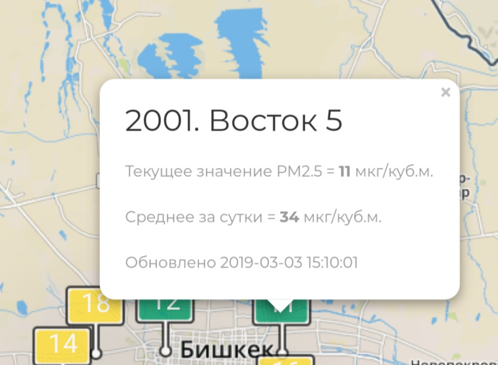 Көк-Жар кичи районунда учурдагы көрсөткүч - 16 микрограмм (сутка ичиндеги орточо көрсөткүч - 58). Дүйнөлүк саламаттыкты сактоо уюмунда сутка ичинде орточо эсеп менен куб метрге 25 микрограмм болгон көрсөткүч норма катары саналат.